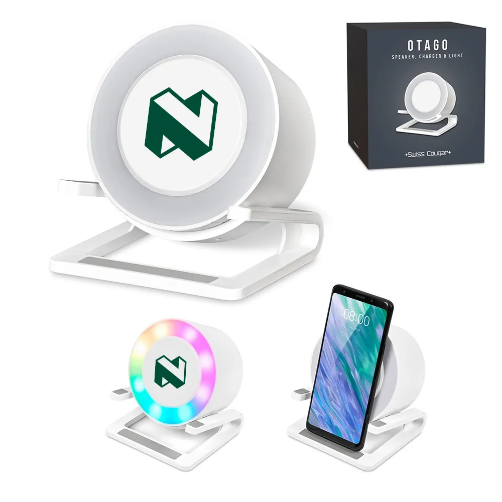 The Swiss Cougar Otago Speaker, Charger and Light is a multifunctional eco-conscious gadget crafted from certified recycled ABS plastic. Combining a Bluetooth speaker, wireless charger, adjustable LED lamp, and phone stand, it’s designed for ultimate convenience at home or in the office. Compact and modern, it offers practical functionality while supporting sustainable design.